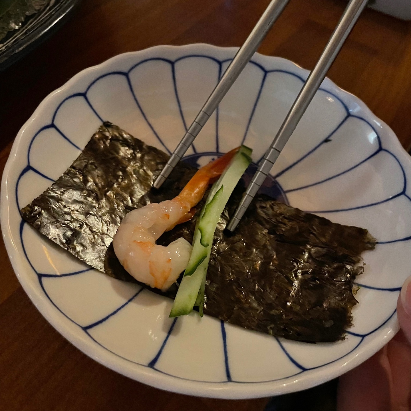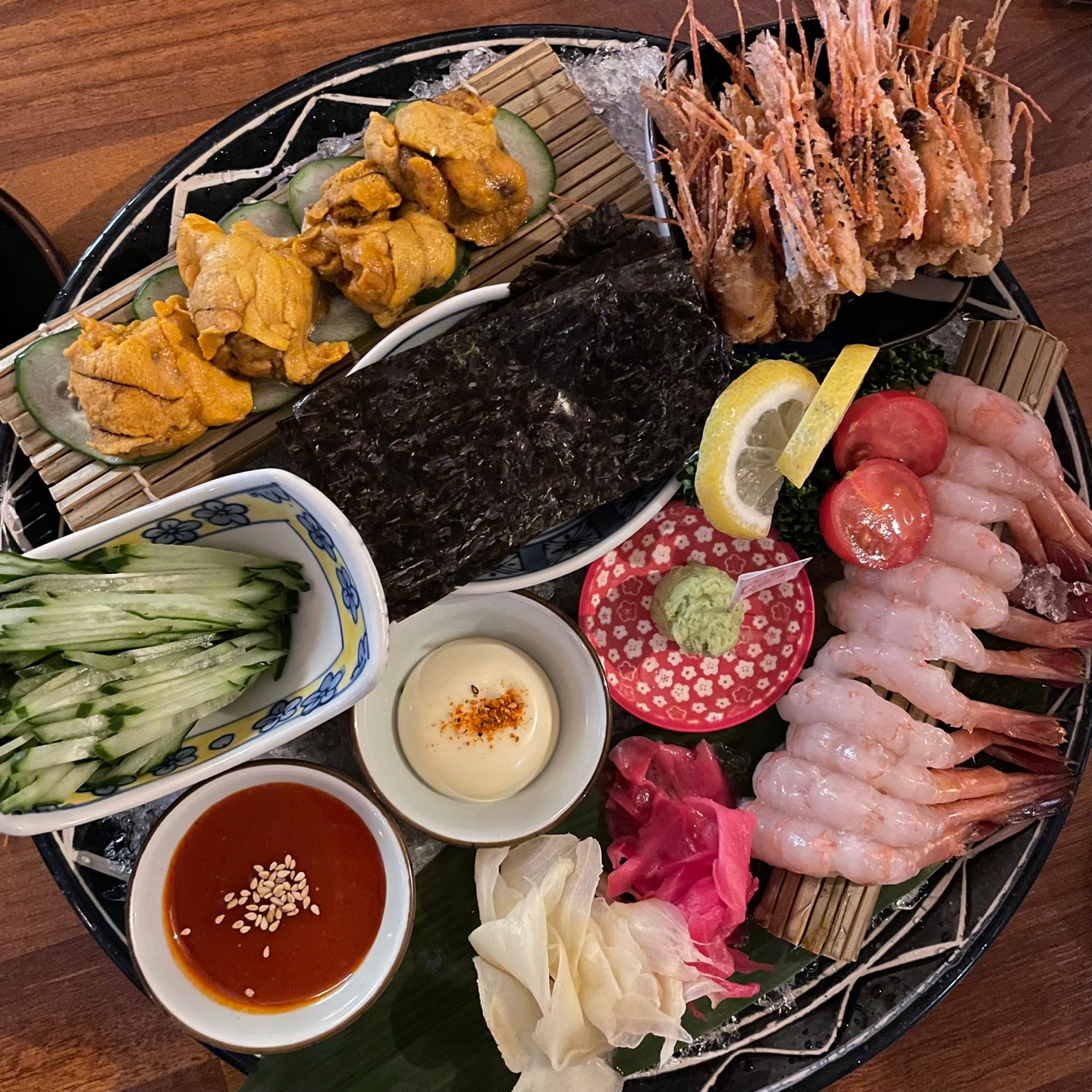 저렇게 김에다가 우니랑 단새우를 넣고 와사비도 넣고 소스에 찍어먹는데 맛은 있더라구요!