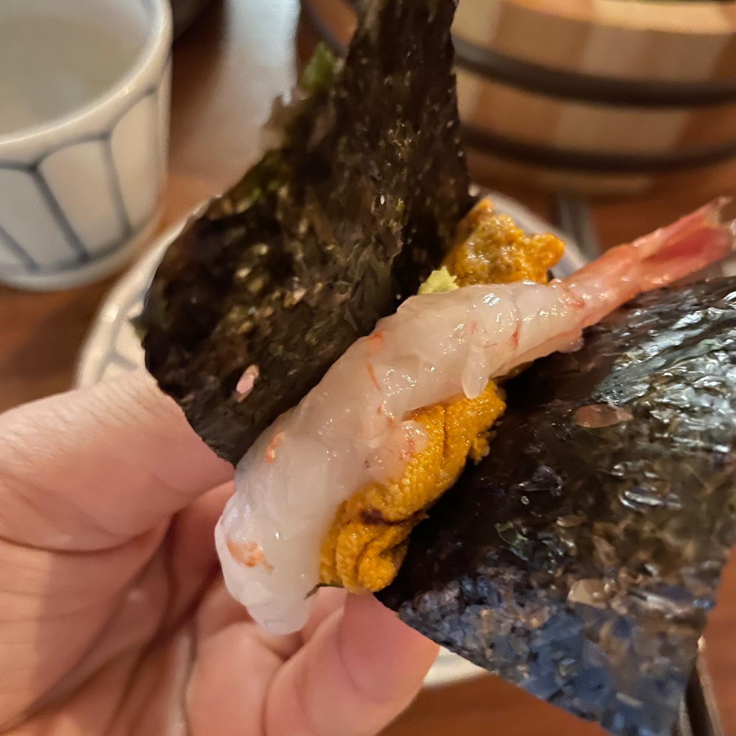 저렇게 김에다가 우니랑 단새우를 넣고 와사비도 넣고 소스에 찍어먹는데 맛은 있더라구요!