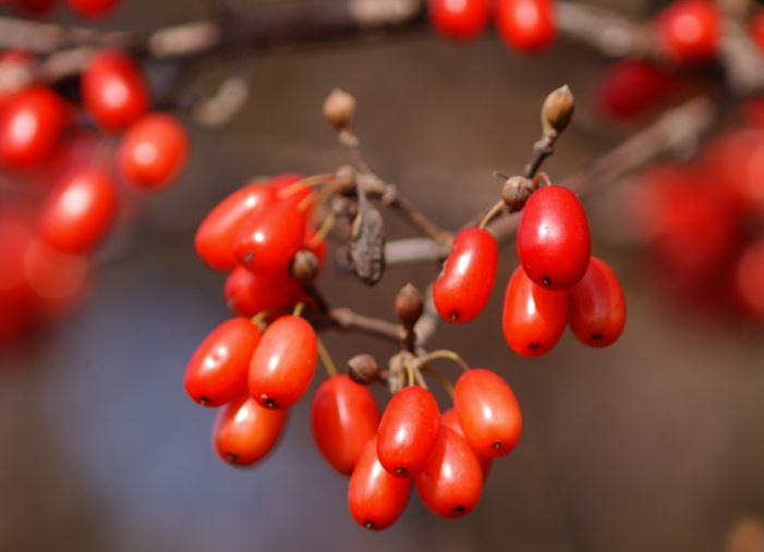 강한 신맛과 떫은맛을 가지고 있는 산수유 열매는 기력이 없을 때