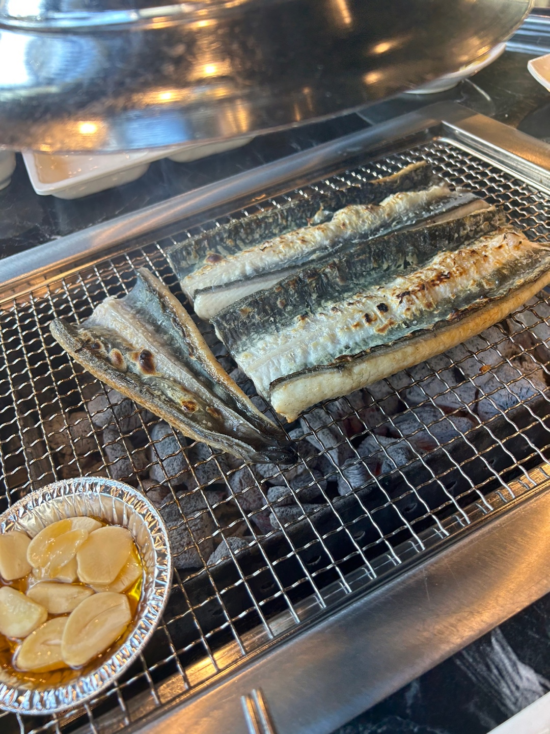 원래는 참기름?에 마늘을 굽는데 기름이 조금 달랐어요 올리브인지 아무튼! 참 맛있었습니다.
